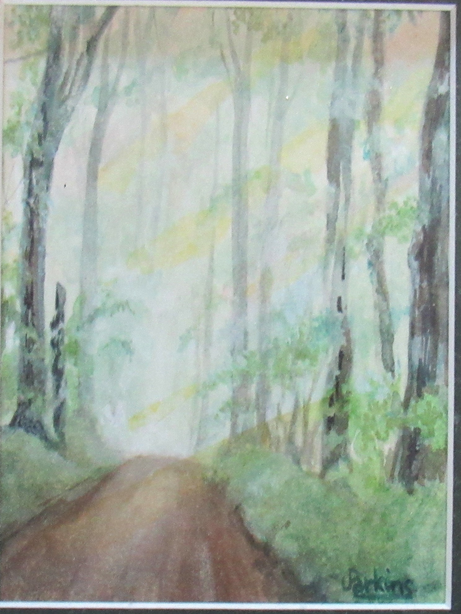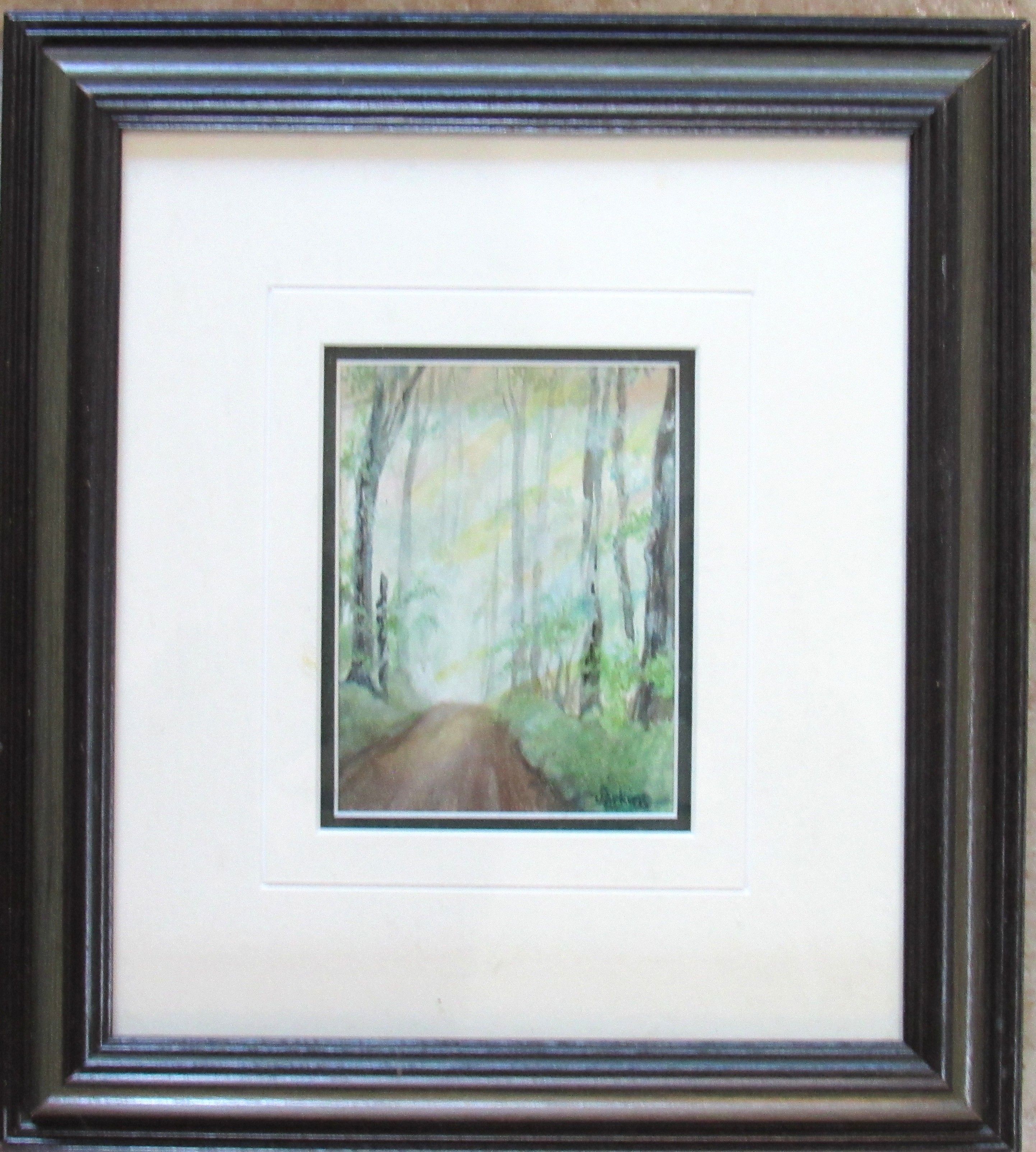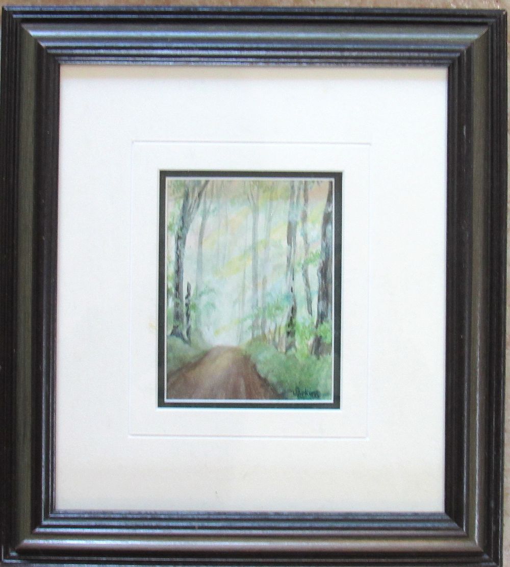 BIN PRICE $25. SIGNED PERKINS DOUBLE MATTED MINIATURE WATERCOLOR COUNTRY BACK ROAD. POSSIBLY PORT HOPE. (FRAMED IN PORT HOPE) IMAGE SIZE 4" HIGH X 3" WIDE.
