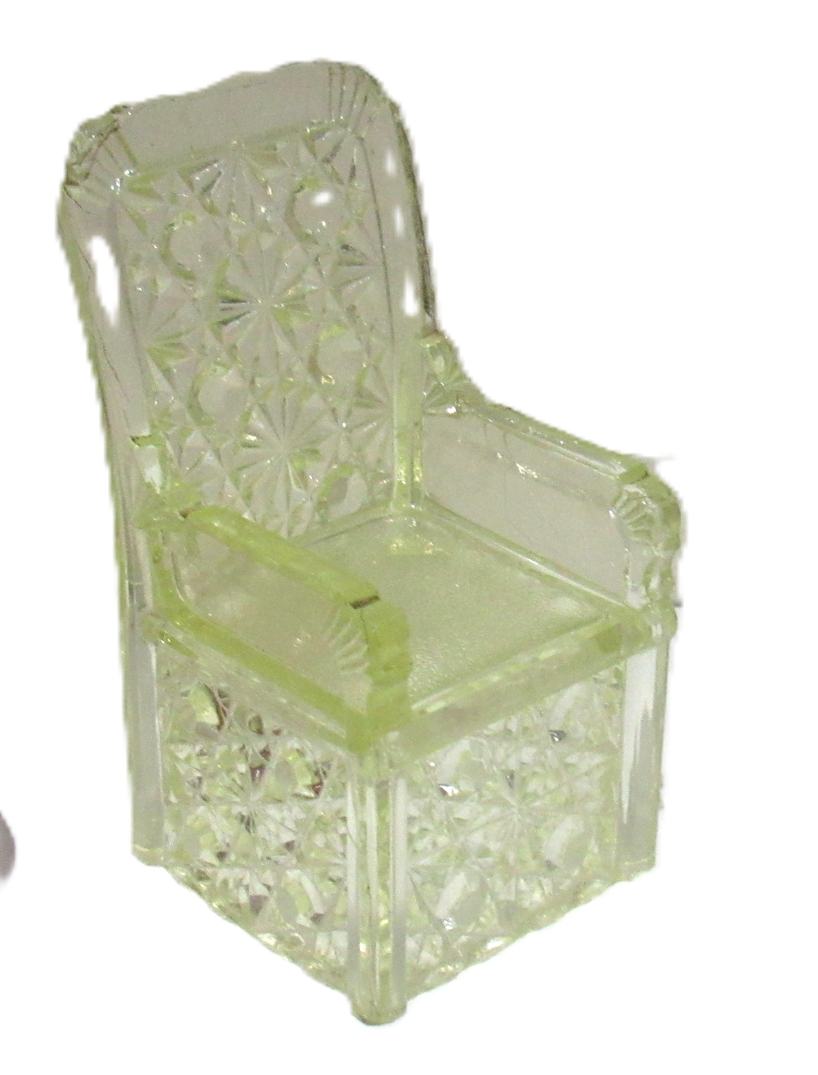 BIN PRICE $45. VASELINE URANIUM GLASS CHAIR.