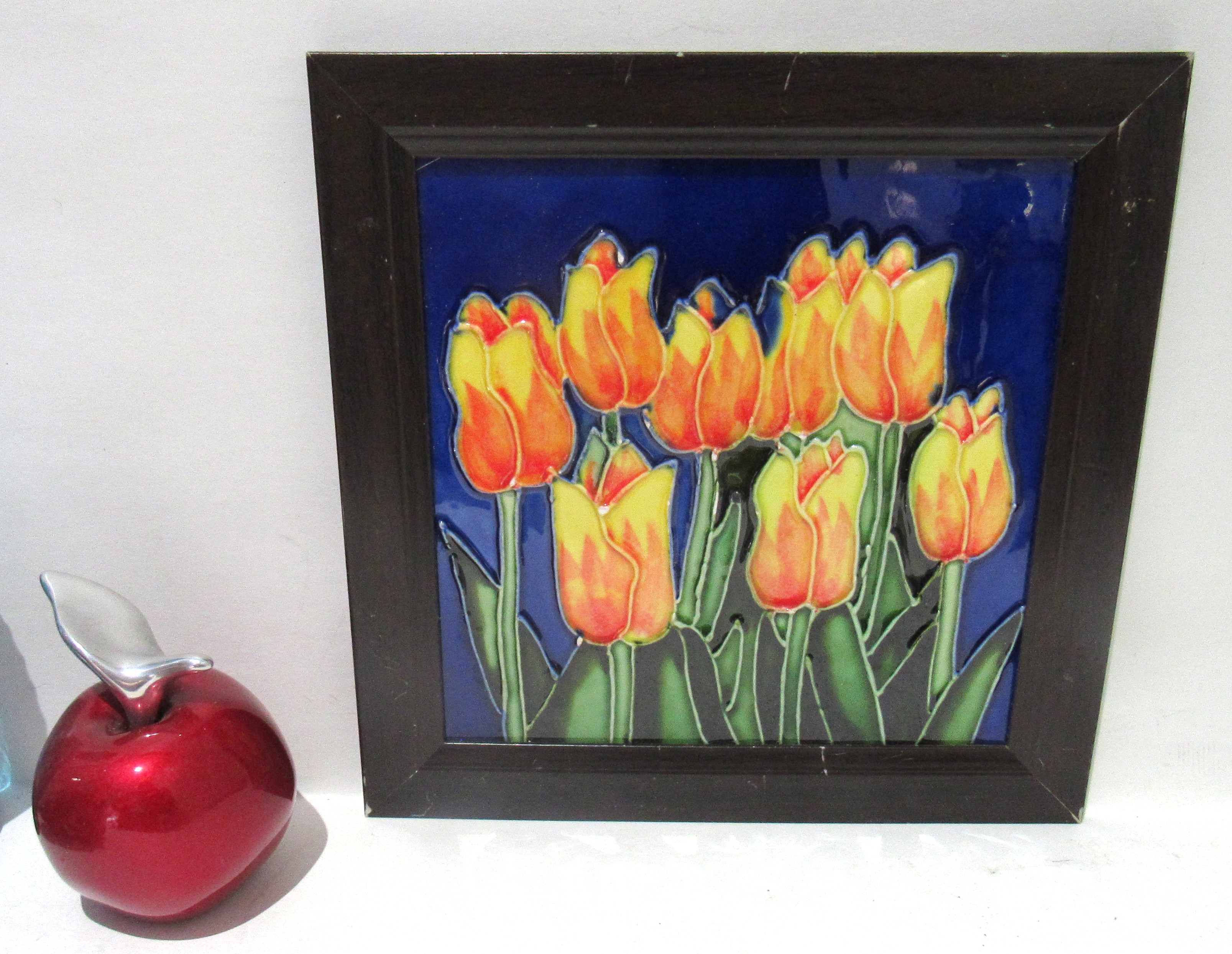 BIN PRICE PRICE $15. FRAMED MAJOLICA GLAZE TULIPS TILE.