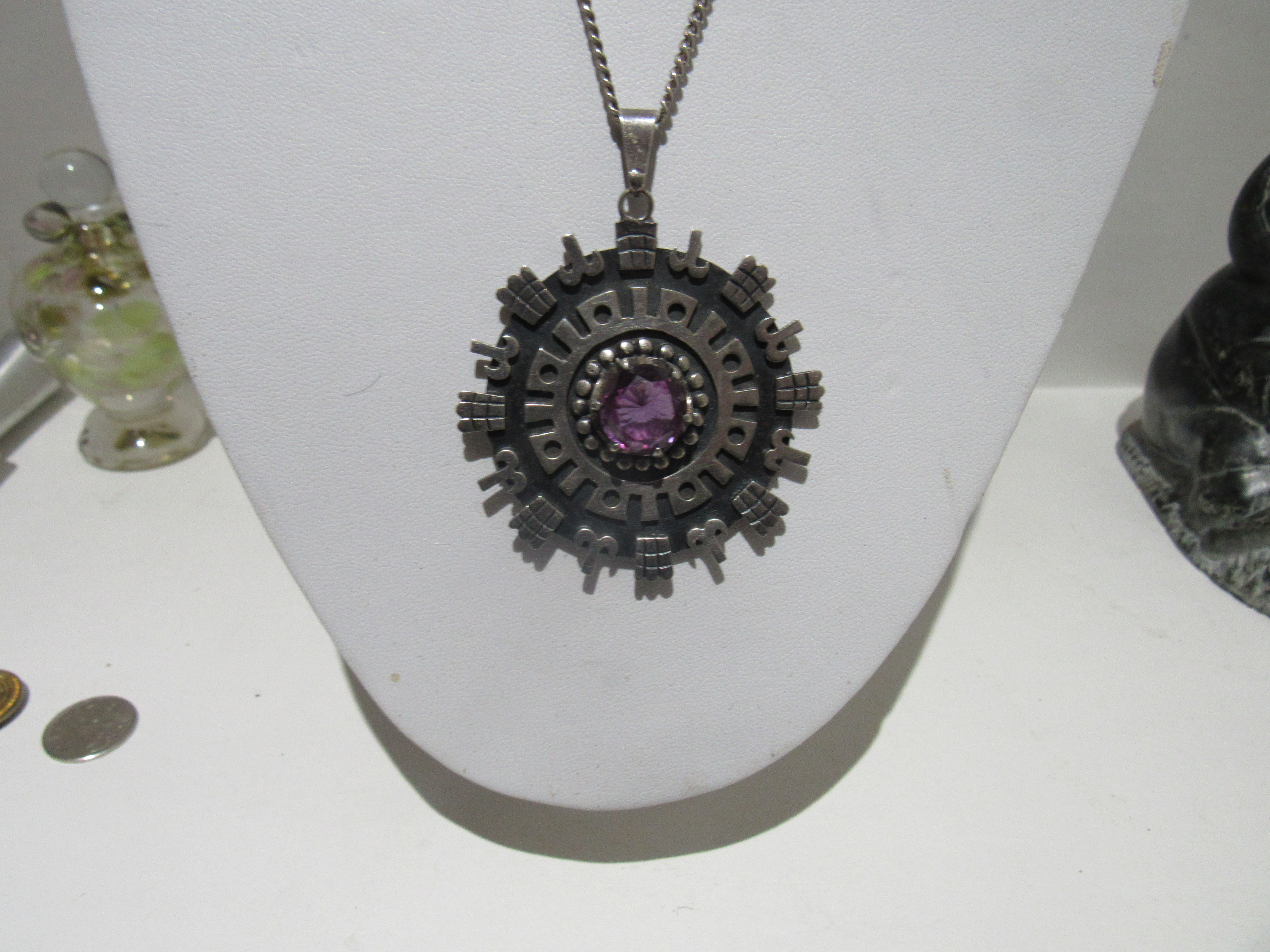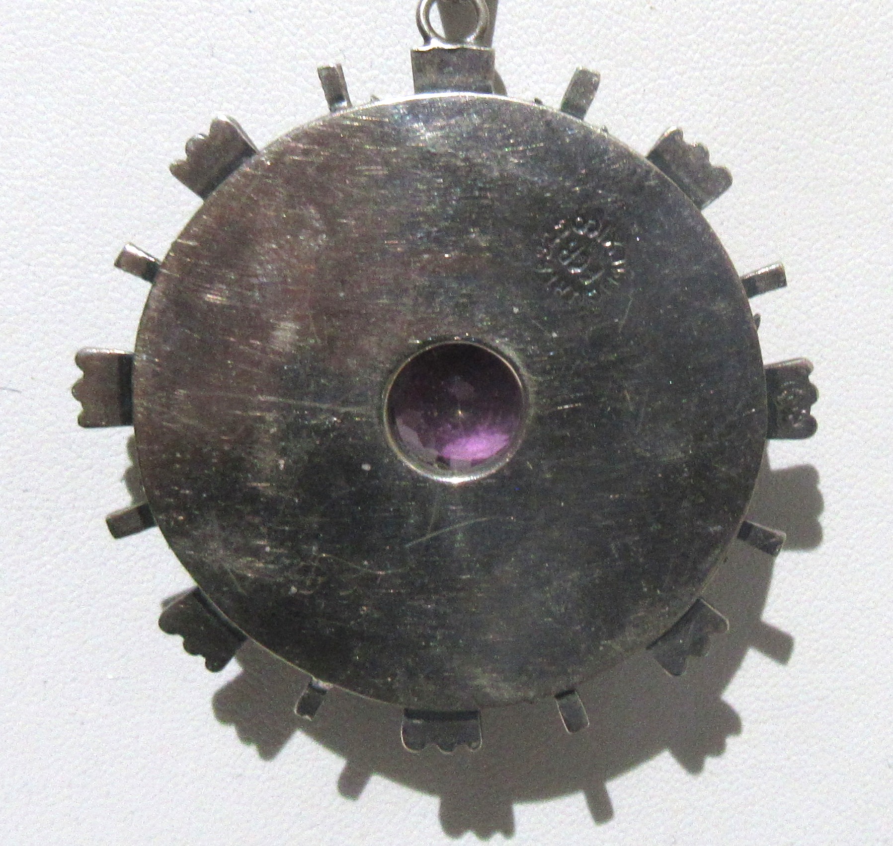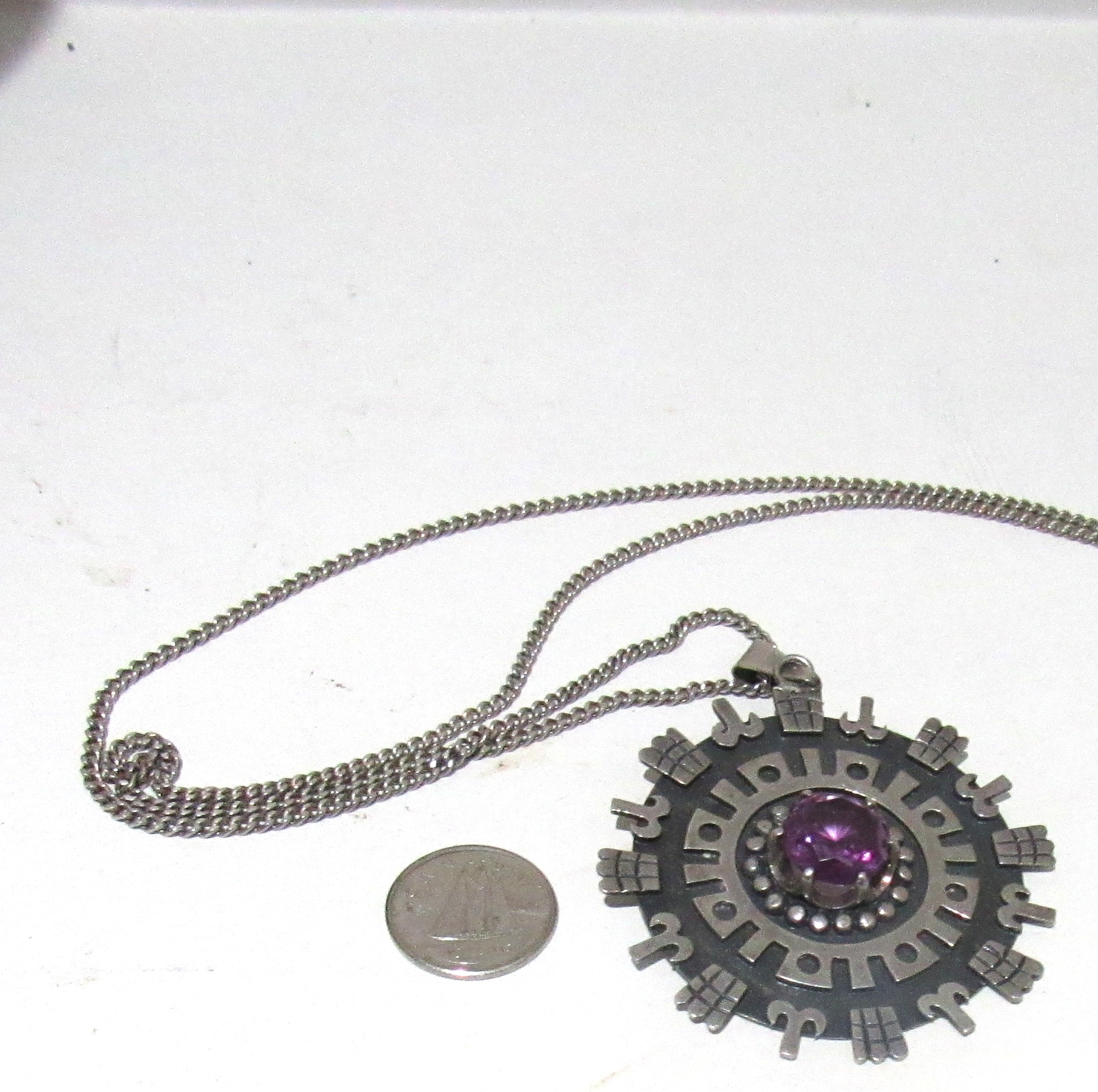 SIGNED MEXICAN STERLING SILVER PENDANT AND CHAIN WITH AMETHYST GEMSTONE. 13.66 GRAMS